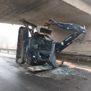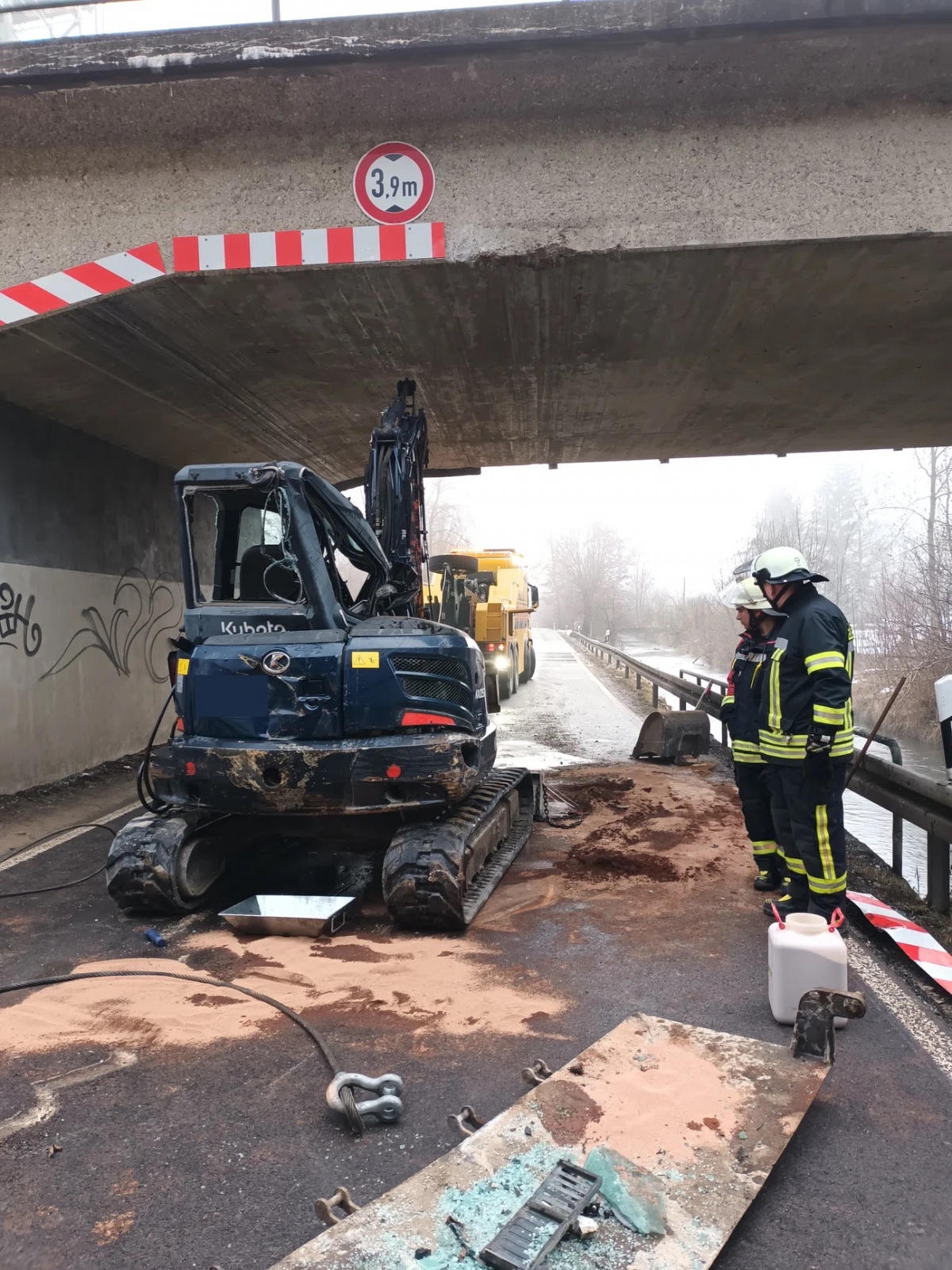 Am 30.01.2026 um 12:23 Uhr wurden wir zu einer Ölspur im Bereich der Bahnunterführung der Münchner Straße in Eschenried alarmiert. Hier sollte ein auf einem LKW beladener Bagger hängengeblieben sein, wobei auslaufendes Hydrauliköl gemeldet wurde. Beim Eintreffen unserer Einsatzkräfte an der Unfallstelle stellte sich die Situation jedoch gravierender dar als gedacht. Beim Versuch die Bahnunterführung zu durchfahren, erfasste der Arm des Baggers das Bauwerk und wurde von der Ladefläche des LKW gerissen. Die Baumaschine kippte rückwärts auf die Fahrbahn und blieb mit schweren Beschädigungen im Bereich der Unterführung senkrecht liegen. Unsere ersteingetroffenen Kräfte forderten sofort die Unterstützung der Feuerwehr Graßlfing nach und richteten die Vollsperrung der Münchner Straße ein. Anschließend wurden große Mengen an ausgetretenem Kraftstoff gebunden, um ein abfließen in den angrenzenden Gröbenbach zu verhindern. Die Kameraden der Feuerwehr Graßlfing sicherten mittels Seilwinde die verunfallte Baumaschine unmittelbar gegen ein eventuelles kippen. Zudem wurde der Kraftstofftank abgepumpt, um eine größere Belastung der Umwelt zu verhindern. Der Bagger musste dann durch ein hinzugezogenes Abschleppunternehmen geborgen werden, wozu mehrere Abschleppfahrzeuge nötig waren.